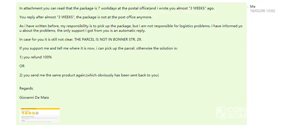 On the courier website the information is still wrong after 3 weeks, because it states that the package is still at the post office, something that it is not true, because i went to the post office twice and the package was not there.