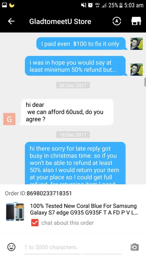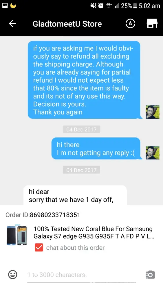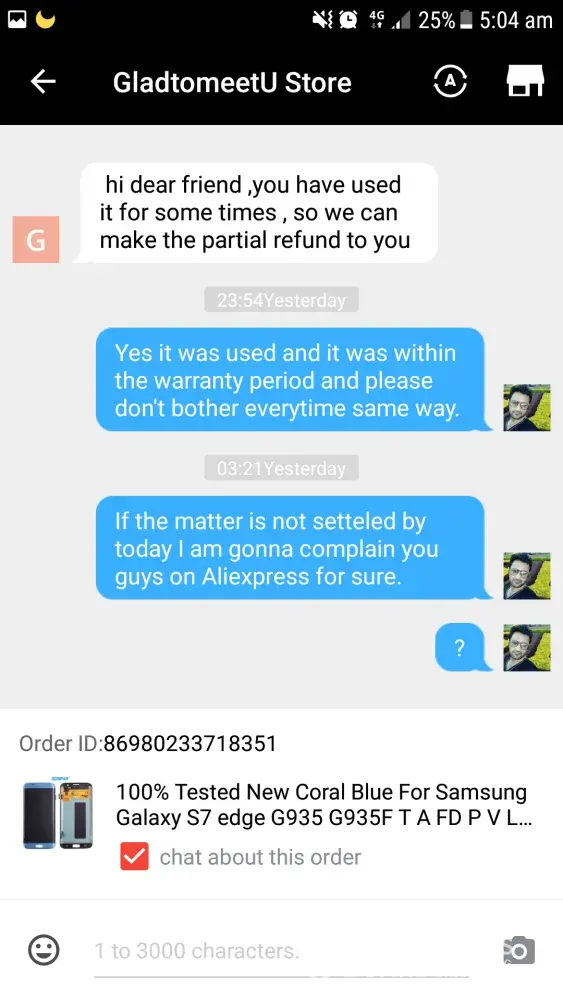 I had bought an LCD screen for samsung galaxy s7 edge order ID [protected] after using some days a pink line appeared from top to bottom of screen and eventually went on increasing and ciuldnot use it by now. When the line appeared on screen I talked to the seller about the faulty screen but they said they donot have another product to replace and as I have used the faulty LCD for sometime they will refund partially although the problem appeared within warranty period.