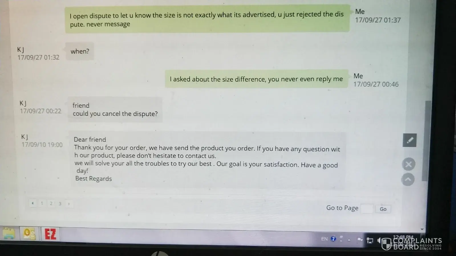 open dispute seller nvr reply, until i wrote to mgt case when they ask me for evidence, seller reply to me ask me close the case and will refund. i nvr reply case mgt thought seller will refund. but when pass the deadline, no refund i ask seller he blame plateform. and now he nvr reply me at all even customer service wrote to him many times. i had went to live chat and repeated almost 10times but everyone at start assure me they will get it solve and thats the last time. but now most of them made me repeat and kp asking me for evidence which i had already submitted. its my 1st time i hving seller do not reply to me and ignore my queries. diff by 3cm i understood, but its adv as man hoodie so definately for a gal should be xxs.
