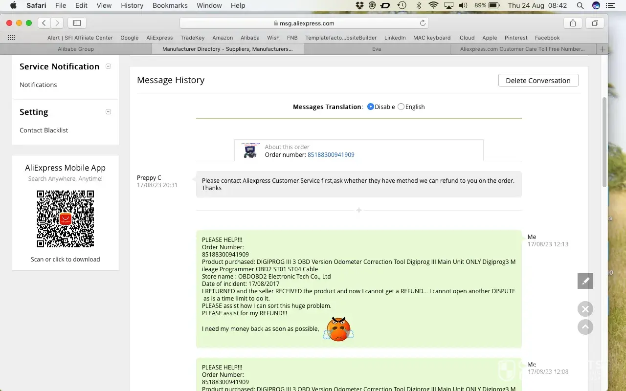 Since then I am keep on chatting with the seller (chat attached), with the life chat (customer care...) NOBODY seems to help me and proceed for a REFUND.