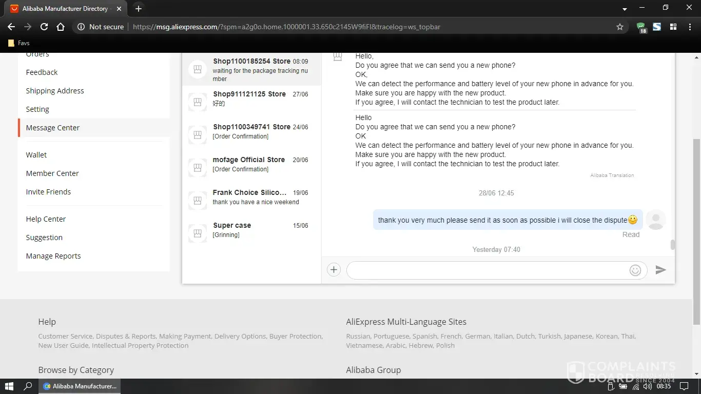 I am sending you 4 screenshots of the last conversation in which we agreed that he sends a new phone without me returning the defect phone