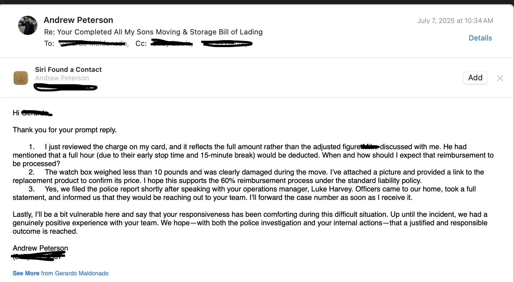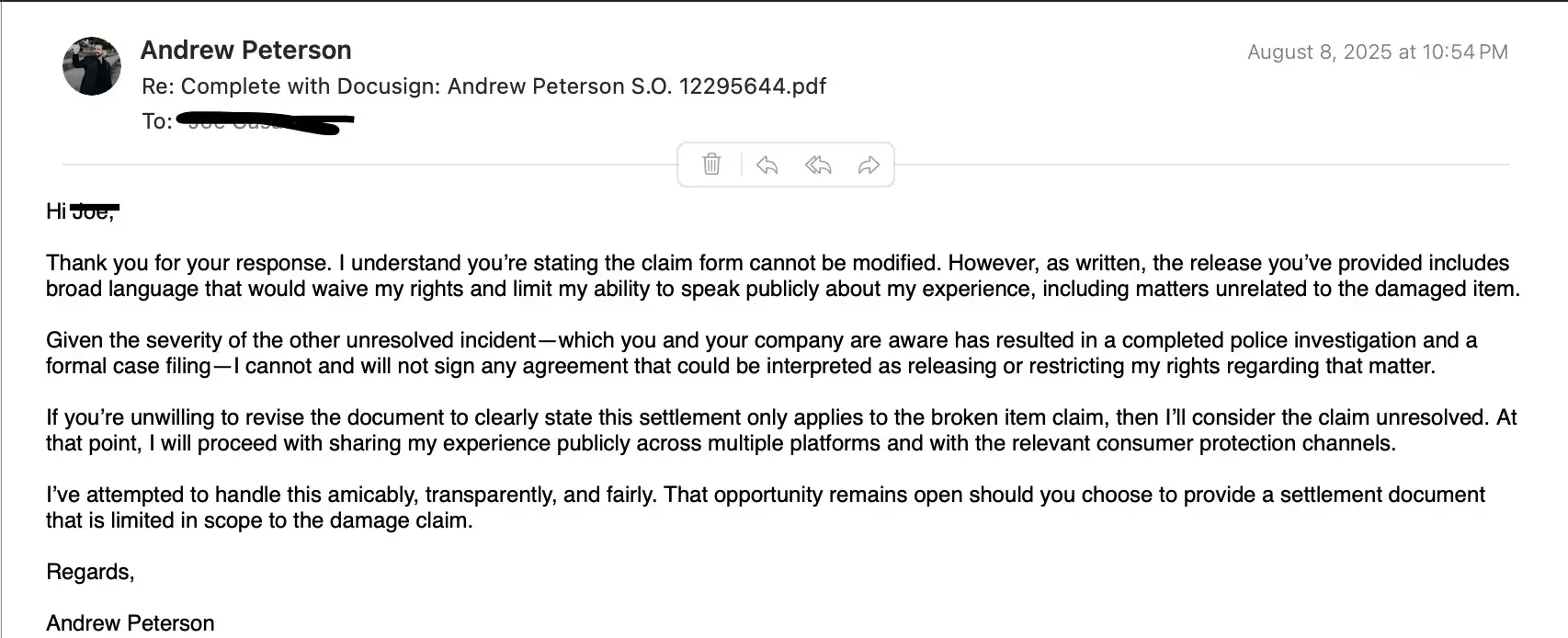 In addition, our property was damaged during the move. When I filed a damage claim, the company sent me a settlement agreement with an overly broad non-disparagement clause — a gag clause — that would have prevented us from speaking publicly about our experience. I asked them in writing to revise the clause so it applied only to the damaged item. They refused. I declined to sign, and they cut off communication entirely.
