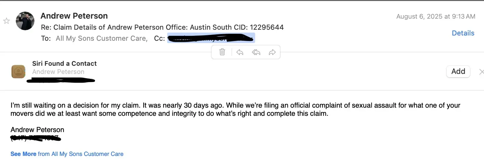 On July 5, 2025, during our move with All My Sons Moving & Storage – Austin South, one of their movers sexually assaulted my wife by making non-consensual physical contact while she was alone in a room. She immediately called me, and we filed a police report that day. The Austin Police Department investigated, and the case is now filed in Austin Municipal Court as a Class C misdemeanor.