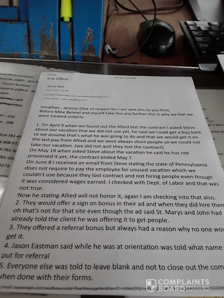 On April 9 2021 we found out that allied lost the contract at the site . Steve Wasyl told us that we would be paid for unused vacation time since we couldn't take it because we didn't have enough people. Then he said the state of Pennsylvania says they don't have to. Also they put out an ad hiring with sign on bonus and when hired 2 people said oh that not for your site and they had a referral bonus that they refused to pay. Also there is alot more unfairness