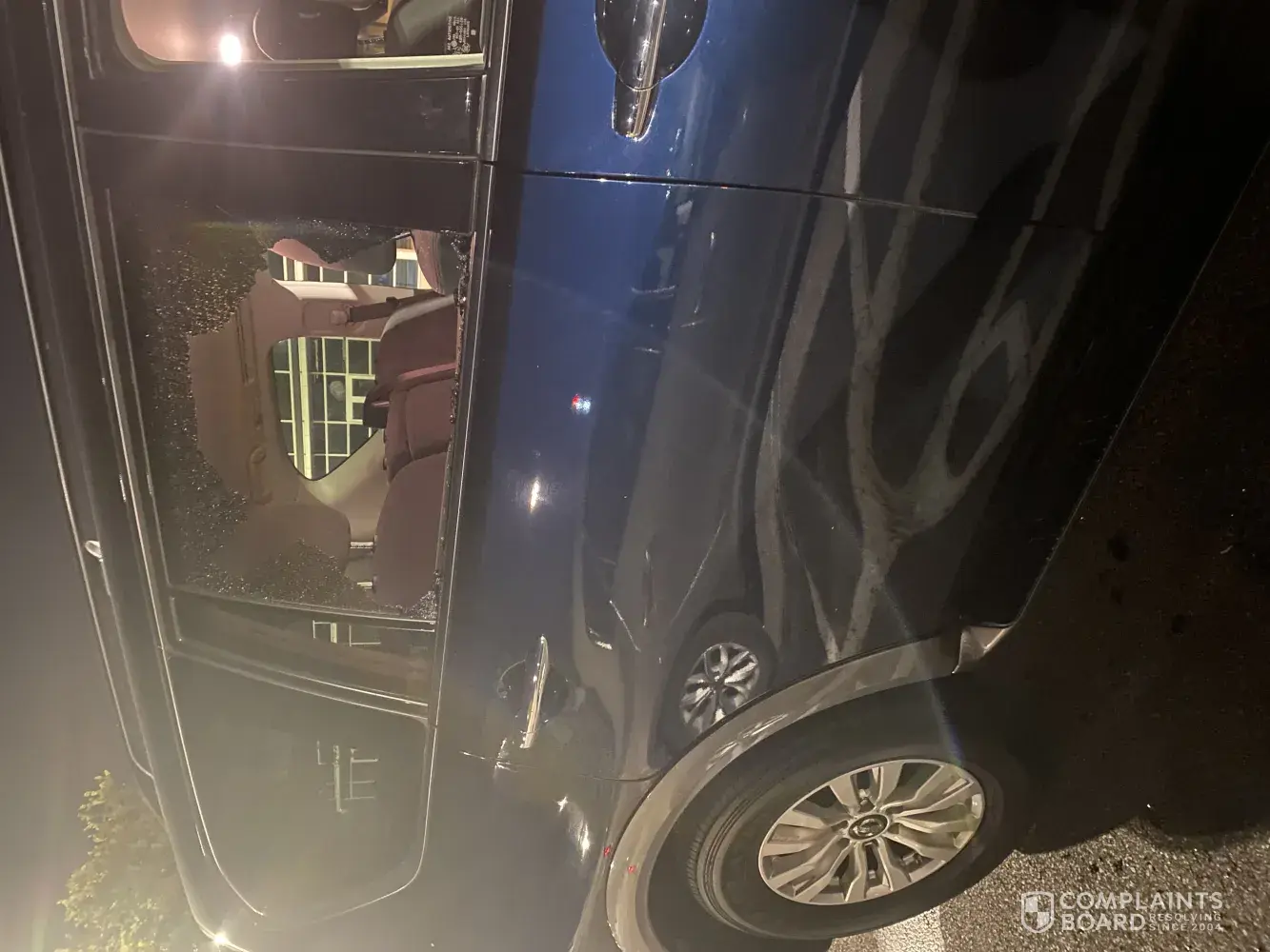 Our vehicle was broken into in the AMC Tech Ridge 9 Movie Theater parking lot in Austin, TX. The truck was in a handicap stall, in direct line of sight of the security officer parked in their pickup truck at the end of the lot. Based on the stalls, the criminals would have had to pull up near the rear of the truck, jump out, smash the window and flee. The vehicle's back window was busted out. Clothes, personal items, a back pack containing wallet with ID credit cards, etc that was under the seat, were stolen. Only the clothing on hangers were visible. One could also assume persons were scouting out vehicles looking in windows.