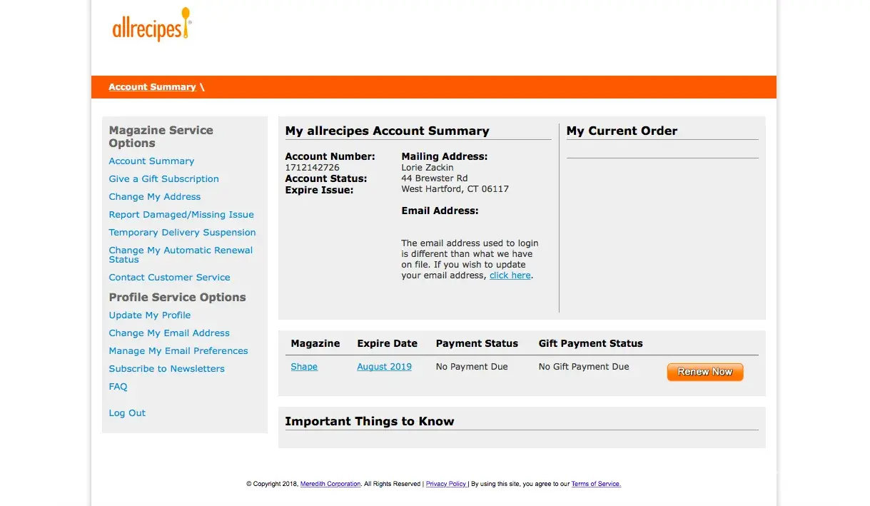 I called AllRecipes and left messages twice and did not receive a callback, and I emailed [protected]@cdsfulfillment.com and attempted to follow the instructions to cancel my subscription only to discover there is no mechanism to do so (see screenshots below). There appears to be no mechanism to cancel my subscription on the website even though AllRecipes claims it allows members to cancel subscriptions. Moreover, like other companies (sorry to say) AllRecipes does not issue notifications prior to auto-subscribe.