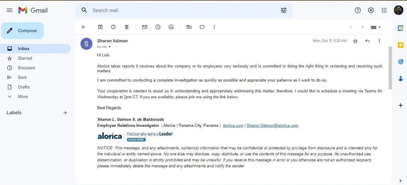 As you know, Alorica has been investigating a report you brought to the company’s attention. We appreciate your patience as this matter was reviewed. I am writing to inform you the investigation has been completed. Based on its investigation, the company was unable to identify any misconduct or other violation of company policy based on your reported information.