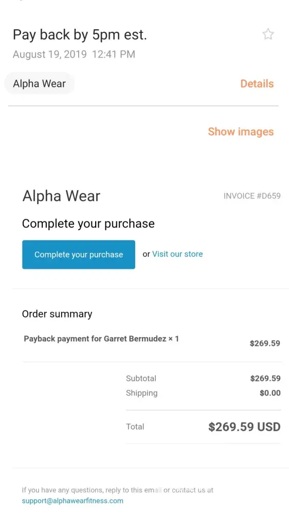 Tough guy albert wants to contact and threaten me has done it to tons of other people. I’m in the hospital and didn’t respond to his texts so he threatens me and then sends the most unprofessional and childish responses. This company is clearly filled with garbage. Who in their right mind while working whether he’s the owner or an employee responds to anyone the way this company has to not just me but tons of others. There’s literally a alpha wear scam/hate page on Instagram with loads of similar cases of this company speaking to people in an extremely unprofessional and inappropriate manner. Grow the [censored] up.