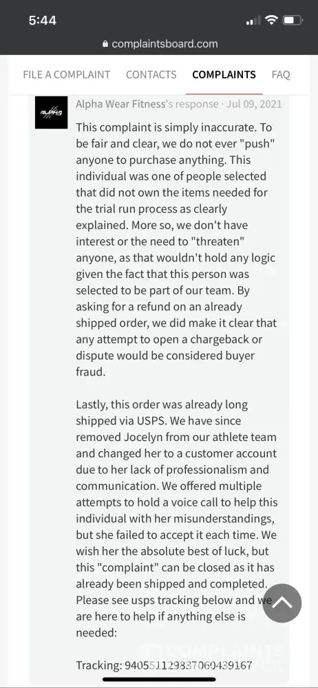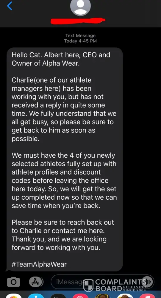 I recently created a purchase through Alpha Wear, after responding to an ad to become a brand ambassador. There was multiple points of contact during the transaction and began to receive direct text messages from the owner, Albert. I was also receiving correspondence from Christian and others on the team. At one point, I was receiving text messages to my cell phone from three points of contact about my order, a "competition" that I was never given full information to participate in or a chance to participate in a future competition. There was much pressure to increase my initial Brand Ambassador purchase from six items to eight items, with the offer of receiving additional merchandise. I received multiple text messages about increasing my order, until I responded that I would not be purchasing more than six items. I was told that I would be a part of a competition to become a paid athlete under the sponsorship of this company. I did not receive the information in order to participate in the competition, and asked multiple times for this information to be sent to me. I also repeatedly asked for my Athlete registration email to be re-sent to me because I did not receive it in any part of my inbox (I checked junk and spam folders). I was sent several times the time stamp that it was already sent instead of being emailed the information within the proper time frame to compete in their competition to become a sponsored athlete. I was contacted several days after placing my order via text message to be informed that my items are not in inventory and I could be provided a larger size. I requested a full refund since they did not have half of what I ordered. I started receive threats of lawsuits, of Alpha Wear "contacting the fitness industry" to disparage my professional career, and the owner, Albert, began to text me again personally while his staff repeatedly pressured me to get on a call with him. Albert was condescending in tone and denied any pressure or issue with my order when I confronted him and when this was filed as a complaint with the Better Business Bureau. They claimed they have since sent my order a while ago, when I was receiving texts last week about an issue with half my order, saying it wasn't in stock like their website stated when I ordered. Stay away! It's a scam!