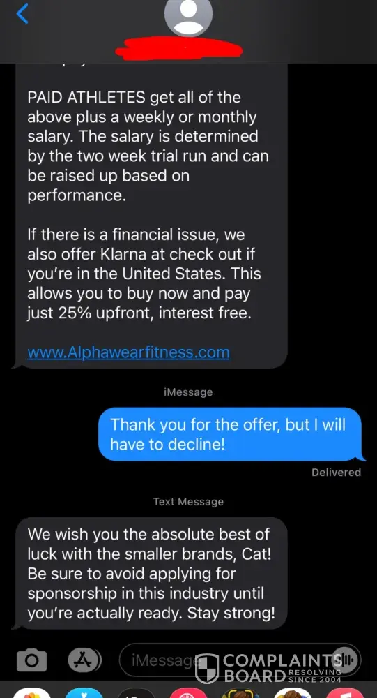 Would give zero stars if possible. I applied on the Alpha Wear to become a brand ambassador/paid athlete and received and text today while I was in class. I was unable to get to it right away but I did respond in about 10 minutes. The representative texted me back around the same time gram, but ended his response with "Prompt replied are highly appreciated" which rubbed me the wrong way. But he asked some questions and ended up telling me that in order to join, I would have to drop $200 on apparel TODAY, which I was unable to do because I am in college and have other expenses. I respectfully declined their offer, and was met with more pushing. After down back and forth, I ended up having to leave class, and when I got back home I had another text, from Albert the CEO, who chastised me for not responding quickly. I have a 15 minute drive from school to my house, so the representative was left on delivered for less than 30 minutes. I declined his offer as well, as he pushed me into buying their apparel, but I told him no as well. The last message that I received said and I quote, " We wish you the absolute best of luck with the smaller brands, Cat! Be sure to avoid applying for sponsorship in this industry until you're actually ready. Stay strong!" How rude, unprofessional, impolite, and so many other words that I probably shouldn't use in this review. Disgusting customer service. I hope this disgraceful brand gets shut down.