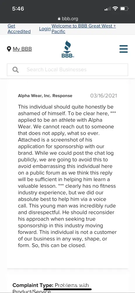 the story is not about me its about my friend who got bullied by the CEO, Albert of alpha wear. This guy texted my friend multiple times in an offensives way, tried to trick my friend to buy his merch so he can become a sponsored athlete. when my friend said no he called my friend "sponsor fishing" and will report my friend. pls take this scam company down. and Albert, pls go F yourself. I MEAN IT, GO F YOURSELF.