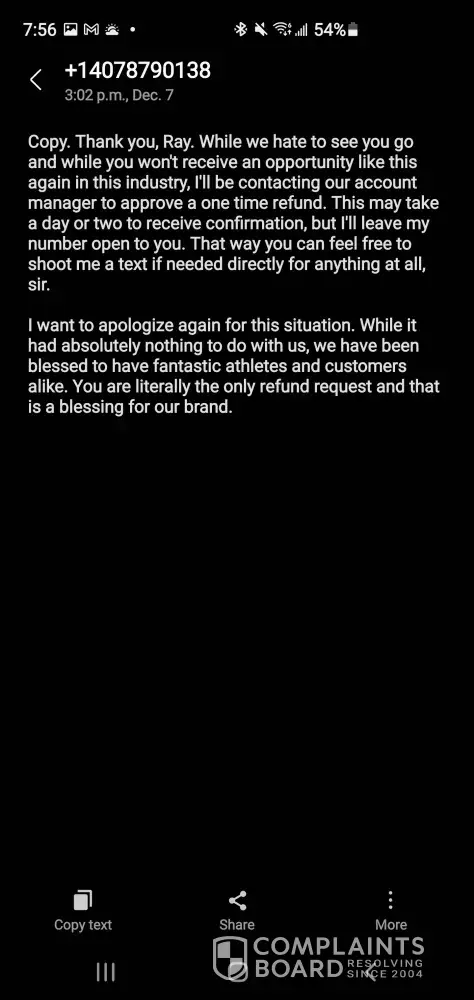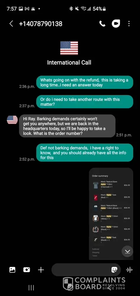 The owner of Alpha Wear, Albert, has reached out with a text 407-879-0138 to help resolve this complaint.
