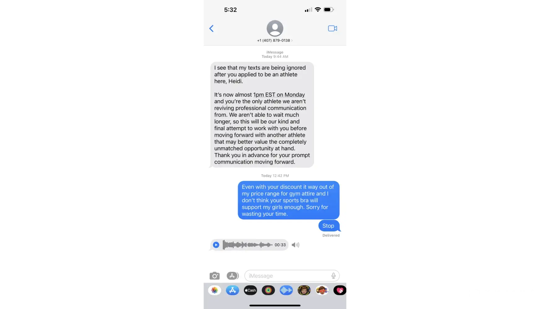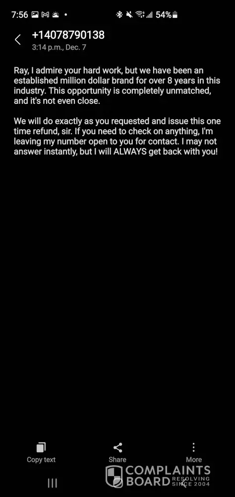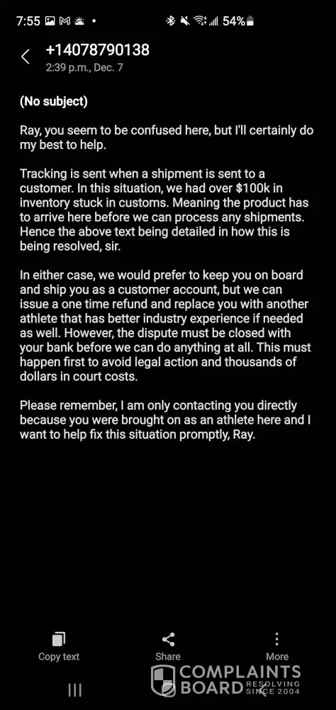 I felt like I was being threatened, there’s lotta scams on the Internet nowadays and I received a text message from this company stating I could get a sponsorship but I need to purchase seven outfits and I didn’t get back to them right away because I have a family and I’m not always sitting on my phone and it was through text message no email no phone call. There were statements made that I was being viewed as a difficult person now to work with and they were going to file a complaint against me so nobody else can sponsor me. I was also told that for a person like myself would never see a better opportunity and that made me unprofessional and I said well the 35-year-old adult in me just doesn’t feel like this is right and I don’t trust it you want me to spend hundreds of dollars on buying merchandise without a binding contract stating what you had put in a text message. I have no problem screenshot Ing all of the messages from this company it’s horrible. Nobody deserves to be treated that way or messaged that way. I feel discriminated against and bullied. And worse of all threatened that if I didn’t do what he asked he was going to report me, So nobody uses me again. That’s definition of character first off second off the whole start of the conversation was how they were unprofessional and forgot to make phone calls. So that’s a first impression I got