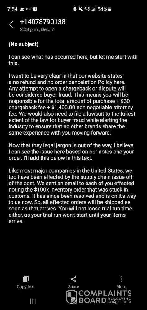 SCAM/FRAUD/LIARS. This company is a total scam and fraud. Like everyone else I got the same text messages telling me how urgent it was to respond and how they were trying to force me into decisions in like a two minute time frame. I was already looking at buying stuff anyways. I was told to hurry up and buy stuff now . I figured what the he’ll, I’ll get what I wanted and use it for that. Less than three minutes later I emailed and sent a text to ALBERT, asking to cancel everything and give refund. They said the stuff already went out. IN THREE MINUTES? my email was time stamped before they sent one to me. I was also threatened with a law suit and how no other brand would represent me. But still had the audacity to tell me to tag them in their stuff. IM GOING TO BURN THEIR STUFF!