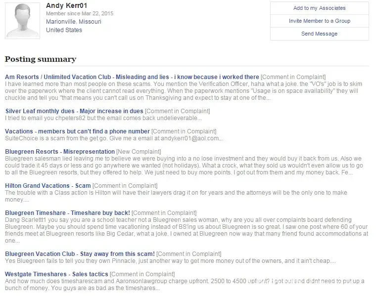 Andy Kerr, From your profile info it looks like you also bought into Hilton Timeshare, Bluegreen Timeshare, Festiva, Westgate as well as others and managed to get out of those as well. Just curious as to why you would keep buying in and then getting out? Surely after one experience you wouldn't want to keep repeating the same mistake! Just curious..