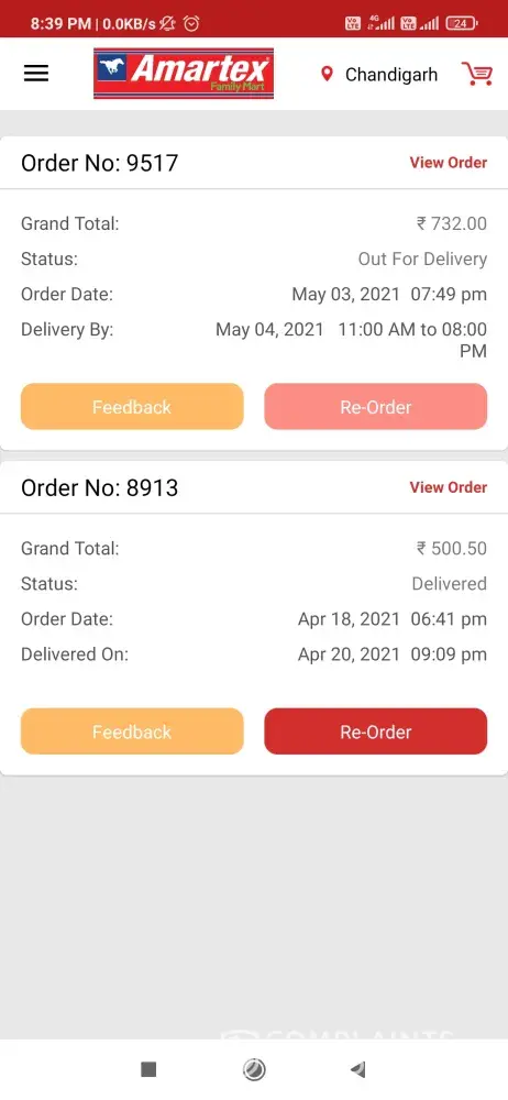 I made oder with order no.8913, dated 18/04/2021, time 06:41PM and it was accepted by amartex for next day of delivery but it was not deliver on that day for which it was fix for delivery.it was delivered on 20/04/2021 at 09:09PM. I made call to amartex c.care and they said that it will not repeat again but on for next order I am facing same problem as the order was accepted on dated 03/04/2021, time 7:49 PM with order no. 9517 but not deliver till date ...I am totally disappointed with amartex service because there is no one who will listen the complaint ..I made number of call to the help line but not deliver my order till now pls take appropriate action for this service act against the delivery partner for delaying oder ...bcz it is very poor service which was provided till now to me by amartex staff Chandigarh