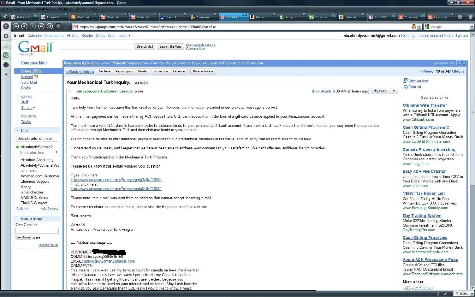 Then on this day 08/27/09 I expect a check in the mail to me for fund owed to me. I understand you will need to wait for the rest of my hits to be approved. by U.S. laws you have to pay me. Me being an American I know those laws. If within 30 days on 09/27/09 I do not recieve a check. I will make sure to report this. I am truely sorry, I do love MTing for Amazon. This is just not right. It does remind me of someone being prejudice. Many have tolds me of this happening with a contest that was held last year, I have also found others like my self that are not to happy. I just want to get paid in funds. Please do get back to me. I want to know if you will do what I asked or not. So I can take the appropriate actions.