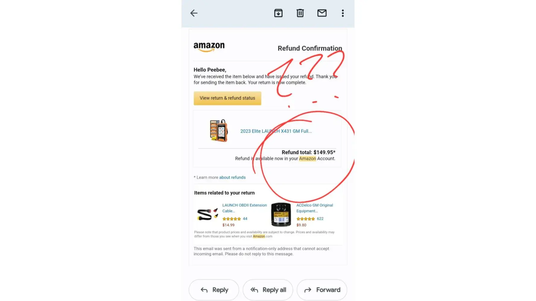 I attempted to purchase a diagnostic scan tool for my vehicle from Amazon. The first one came with zero instructions and when I attempted to download the software from the manufacture website, my pc wouldn't allow it, saying windows security blocked it for having trojans attached. So I returned it. I then purchased another diagnostic scan tool. That didn't work either, it wasn't for my specific vehicle even though the Amazon ad said it was. After contacting the manufacturer to get help and them telling me my that their scan tool in fact does not work for my vehicle I returned that one as well. After a long wait I was finally issued a refund. Only instead of being refunded back on my debit card like I asked, I was given an Amazon credit. A partial amazon credit at that. The purchase was for $179 for whatever reason and without explanation I received $145 amazon credit. I am so tired of going around in circles with Amazon that I just gave up and accepted it.