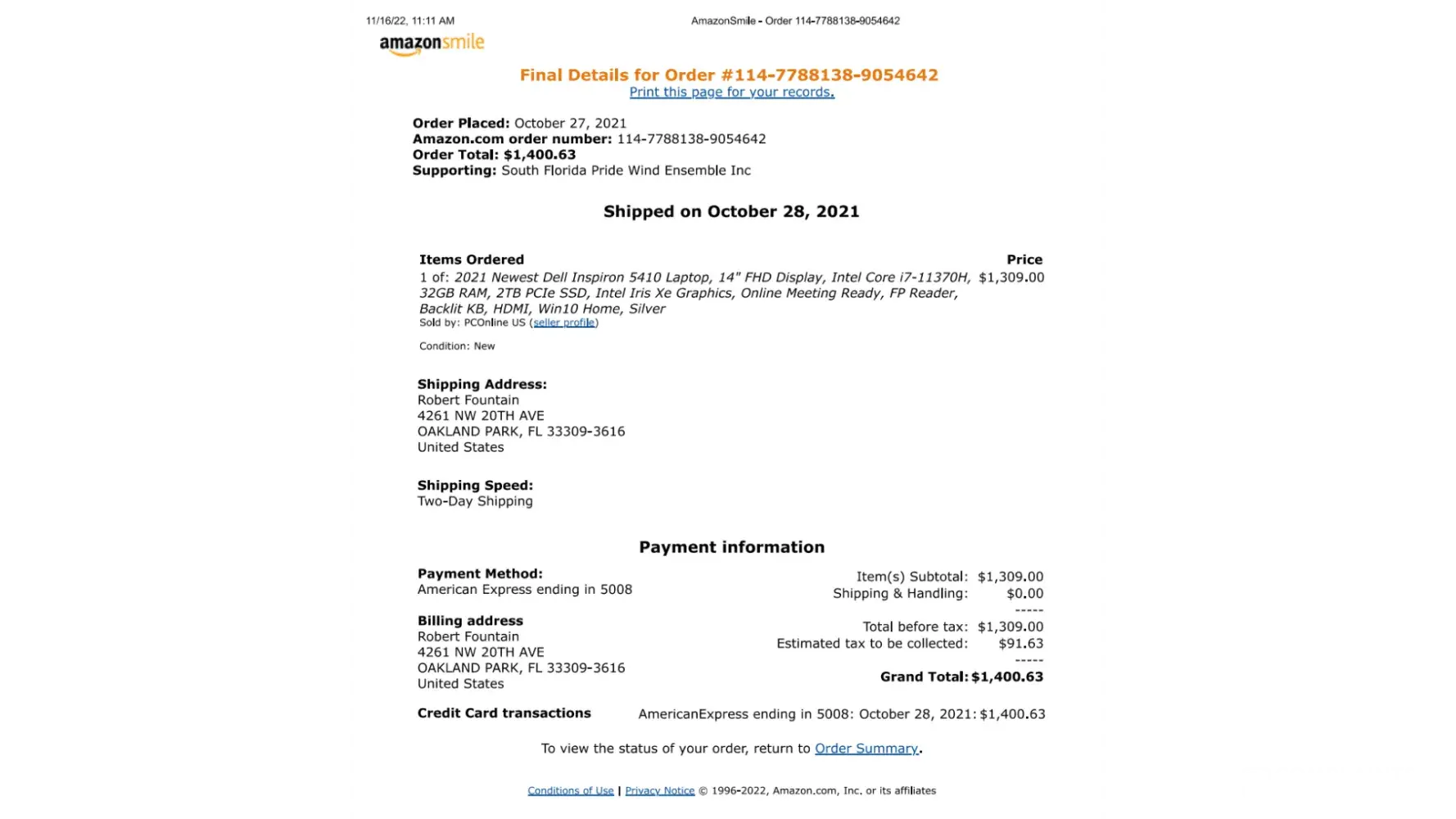 On October 27th, 2021 I purchased a Dell computer from Amazon: Dell Inspiron 5410 Laptop. (See AmInvoice#1)
