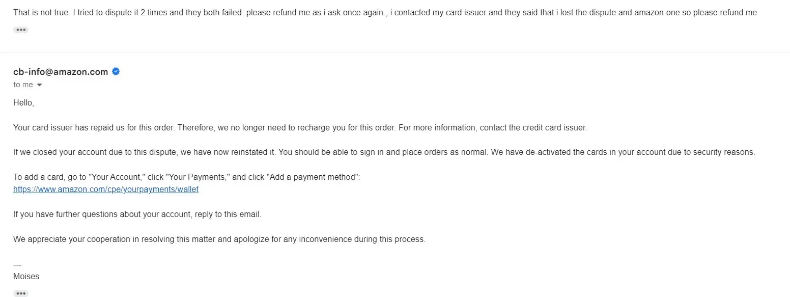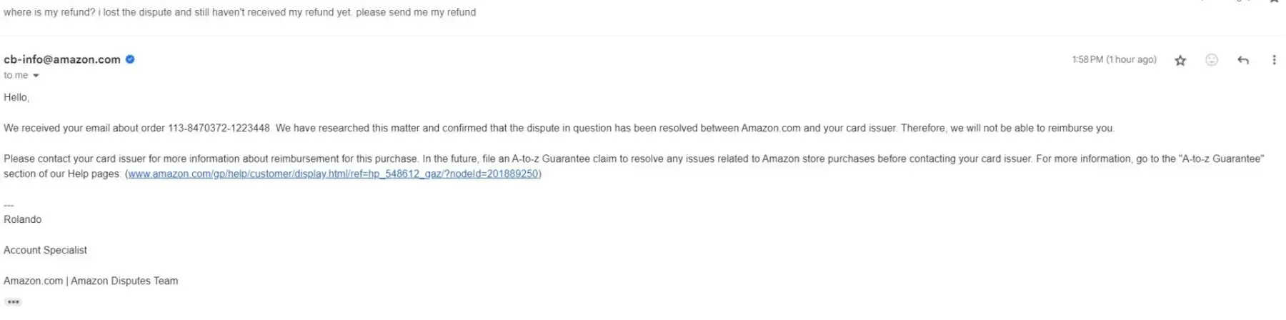 i purchase a drone from amazon and when i returned it they didn't give me a refund for some reason. when i contacted them about it they just refused to refund me for some reason so i decided to start a dispute. i ended up losing the dispute and when i contact amazon they say that they dont have to reimburse me at all. this is crazy and i need my money back