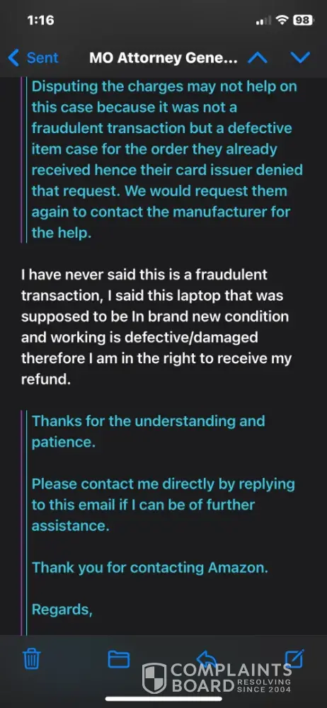 I Paid $438.64 for a Lenovo Laptop from Amazon the Order Number is [protected] then once the Brand New Lenovo Laptop had arrive to my house I had opened the package and to my surprise I seen a big damage dent on my Brand New Lenovo Laptop (As Shown in the Photo Circle in Red) Then 2 weeks after I had received the Lenovo Laptop on Wednesday June 7, 2023 it started having issues such as not turning on properly sometimes and having this error consistently popping up in my screen saying that “Your device ran into a problem and needs to restart. We're just collecting some error info, and then we'll restart for you.†(As Shown in the Photo) But unfortunately this keeps happening even till this day. So I contacted PayPal to Dispute this $438.64 Transaction on July 10, 2023 (As Shown in the Picture) so I can get my money back because the Lenovo Laptop is damaged. so for the meanwhile I was doing my part by submitting multiple evidence to get this $438.64 dispute claim close in my favor, but unfortunately PayPal denied and close my $438.64 Dispute claim on August 8, 2023 by claiming that they denied my $438.64 Dispute claim because this transaction was processed correctly (As Shown in the Picture). Which is irrelevant because the whole reason why I open this $438.64 Dispute claim with PayPal in the first place is to get my $438.64 back because My Brand New Lenovo Laptop is damaged not because the transaction wasn't processed correctly. So I made some complaints to Amazon then on January 14, 2024 I received a email response from one of the customer representatives from Amazon about my complaints (As Shown in the Picture) he claims this is not a fraudulent transaction but a defective item which is why my dispute claim keeps getting denied and I won’t get my refund but I keep making it clear that this a defective/damaged item not a fraudulent transaction. right after I said that the Amazon customer representative said a very generic sorry response and never reply back to me again (As Shown in the Picture)