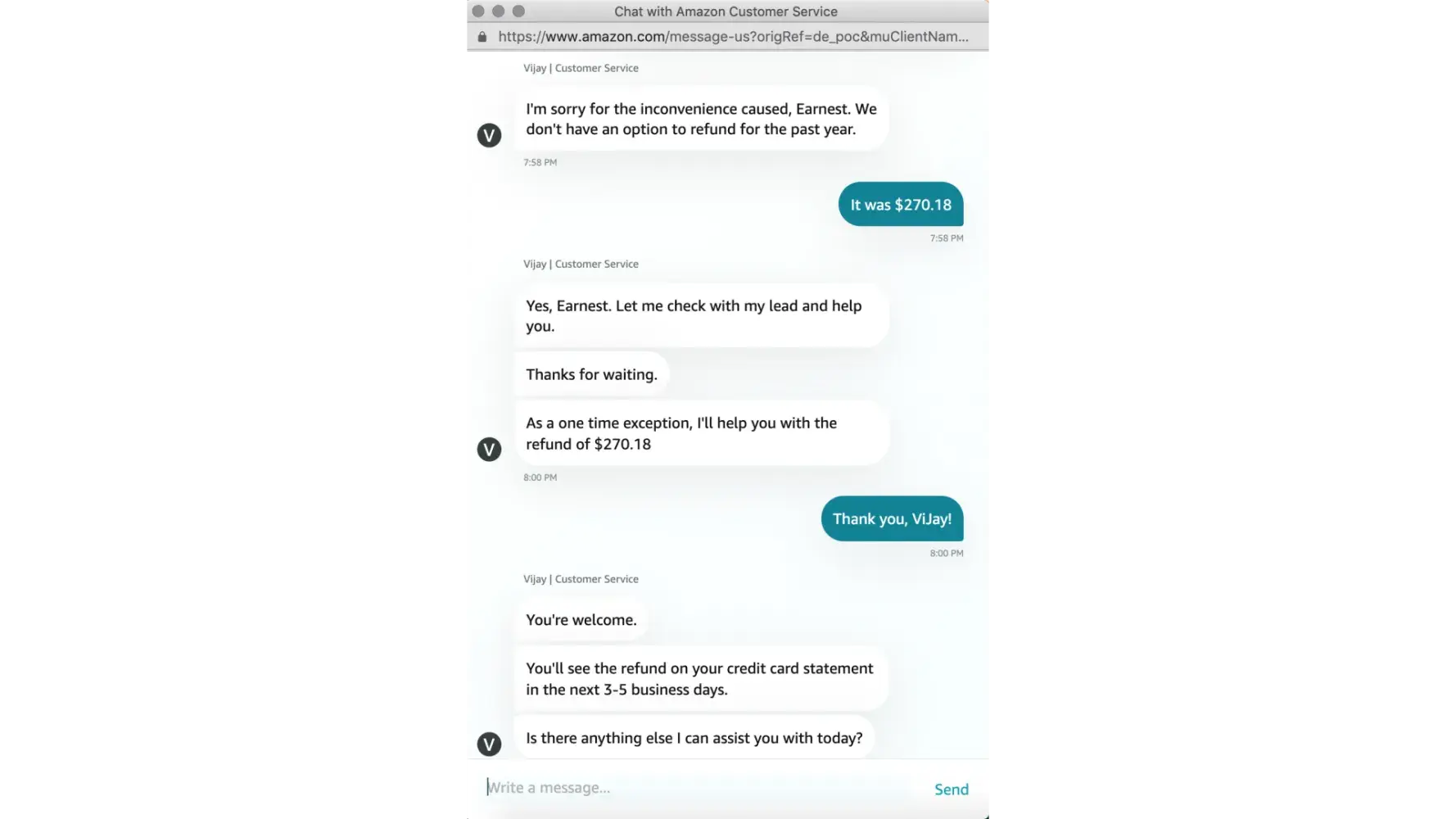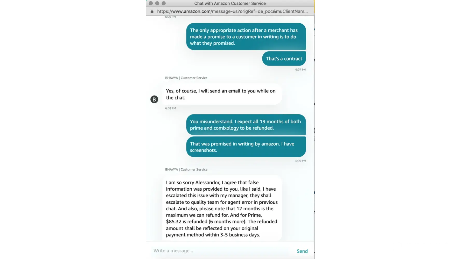 Desired outcome: I would like a full refund of all charges, as promised in writing by Amazon.
