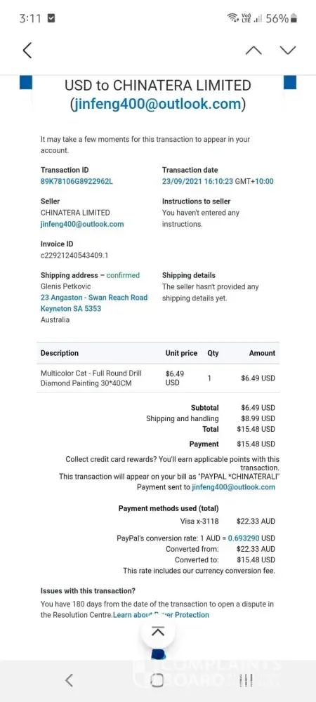 For a diamond painting where i paid $22.33 AUS and $15.48 US.