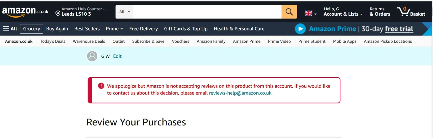 'We apologize but Amazon is not accepting reviews on this product from this account. If you would like to contact us about this decision, please email [protected]@amazon.co.uk.'.