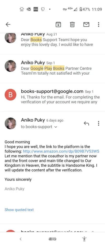 I would like to make a complaint regards to my published book by Amazon Direct Publishing tool. The book was originally published in Word format not on the base of my imagination, when I checked on what was published I unpublished it. Then I several times uploaded without success the epub version, it always displayed final1. epub uploaded successfully, but still the deformed version was there of course I think in order to humiliate me. After several tries I succeeded and the good version, which I also reviewed and screenshoted, it was kept there for 2-3 days, but today again after checking the wrong format has been there for my humiliation and humiliation of my work. Why that wrong version is never removed from there, tell me? What are these tries? Why should I check always if there are not scamming me again and again? Can anyone explain me this nasty behaviour? Why they don't keep there the normal beautiful perfect epub version? I'm asking for confrontation with the responsible person for this scam and financial compensation, I have proofs