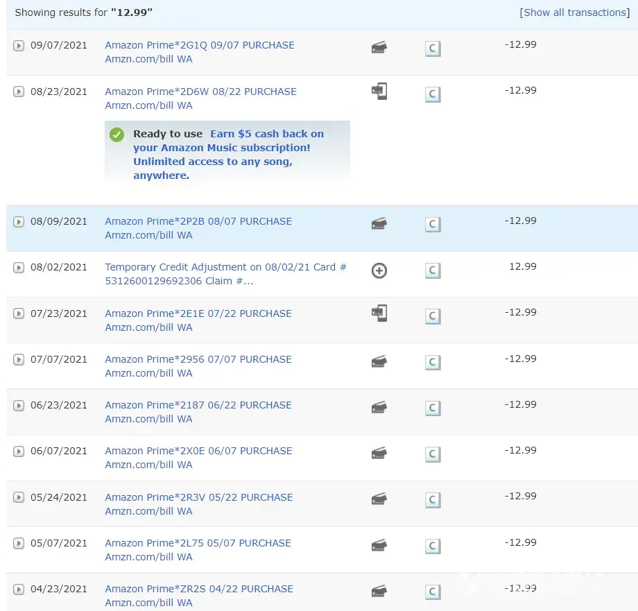 Active offerReady to use Earn $5 cash back on your Amazon Music subscription! Unlimited access to any song, anywhere.activity type Virtual card - 12.99 Amazon Prime*2D6W 08/22 PURCHASE Amzn.com/bill WA