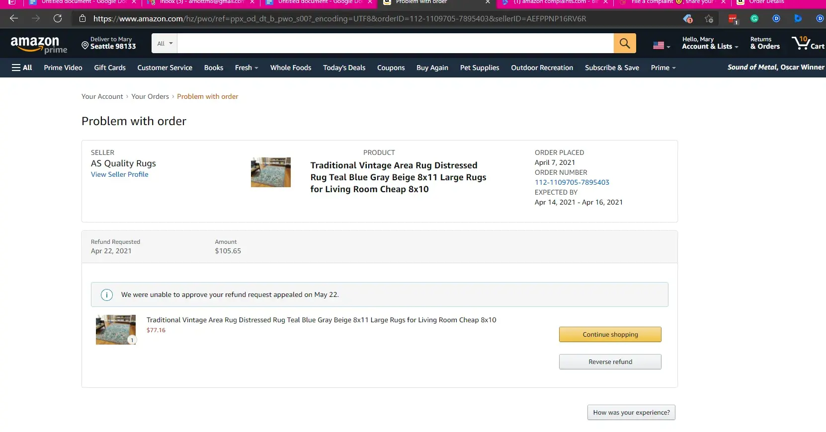 AS Quality Rugs on April 7th, 2021, through Amazon. I paid shipping as well to have it delivered. It was running late and Amazon stated on their web page if I did not receive the rug by the next day I could get a refund. I canceled the delivery and requested a refund. I filed a claim against FedEx because it was stated that it was delivered to the front door. I live in an apartment complex with 3 separate buildings each building has 2 doors. I never signed for this purchase and I never received it. When I canceled and asked for a refund I was hoping the delivery would be intervened and shipped back to the seller. Amazon is denying me a refund on this rug. I just want a full refund that in which I paid so I can purchase a different rug somewhere else. I've contacted the seller more than 4 times, no response. I filed several EZ claims all been denied!