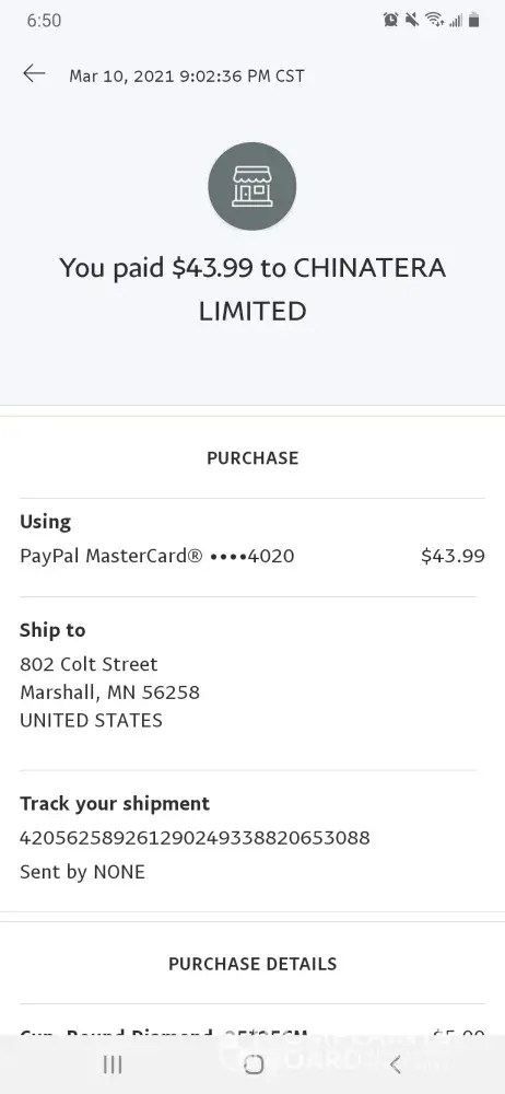 I paid for 5 products from Chinatera limited from Facebook advertising which was $5 per diamond painting and payment was through PayPal. I received a shipping label for usps three days later but usps says has not received product, now 12 days later. It gives address of Melrose Park Illinois as where the shipping label was created. There is no contact information in PayPal or post office. O have no received items.
