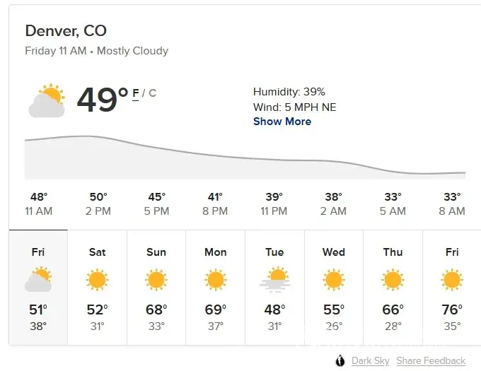 As proof, see the attached current weather forecast for the Denver area. Or go look it up for yourself. Either way, there is NO "weather" interfering with any deliveries from Amazon or anyone else, and there hasn't been any bad weather since March 15 at the latest. (Today is March 26 -- ten [10] full days ago.)