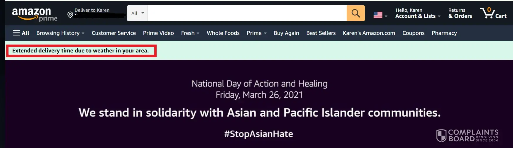 Ever since Denver had the big snowstorm on March 14 -- which lasted ONE day -- Amazon has been displaying "Extended delivery due to weather in your area" at the top of the landing page; see attached. Every item on Amazon has extended delivery times of four (4) days or more, when my Prime membership is supposed to provide 1- to 2-day delivery on most items.