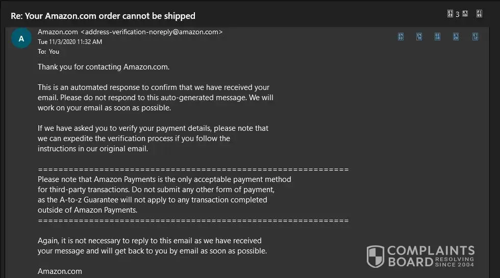 Amazon has placed a hold on my Amazon buyer account [protected]@outlook.com since the end of October. Amazon emailed me asking for proof of receipt for the Amazon card I used to make the last online purchase. I sent proof of receipt for the Amazon card I used. Amazon has not lifted the hold on my account. I want the hold on the Amazon account [protected]@outlook.com to be lifted so that I can use the account again.