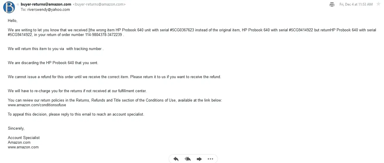 On October 20th 2020. I purchased a HP Probook 640 computer that did not work. I was sent a return label. I used the buy again option to purchase another one on November 11th 2020. Since I needed a computer to work from home. Once it arrived I used the return label amazon sent and put the one that did not work in the box the new HP Probook came in and returned. Amazon said i returned wrong one. it is not the wrong one, it is the one they sent me that didn't work properly. I asked them to send it back so i can see and they refused to do that. I have attached an email with more specifics.