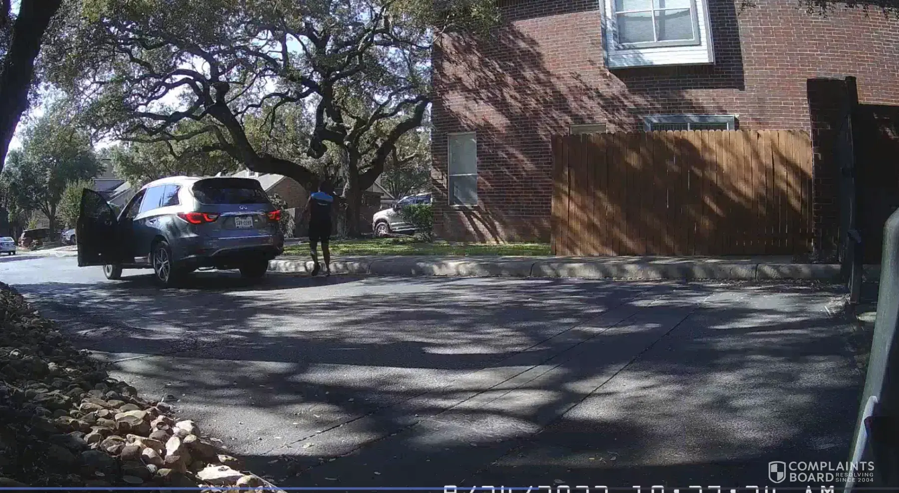 We noticed our subdivision gate was hit by someone and damaged an optical unit that detects if there is a gate obstruction. We are called the Lost Oaks Home Owners Association here in San Antonio, Texas. The gate stays open permanently when this device is damaged. We have a camera system and captured footage of a gray Infinity SUV hitting the gate, then stopping, getting out, and inspecting their vehicle for damage after it contacted the right side. The person was wearing a blue Amazon delivery vest. We captured the license plate as well which is identified as Texas Tag ID: SXY 3199