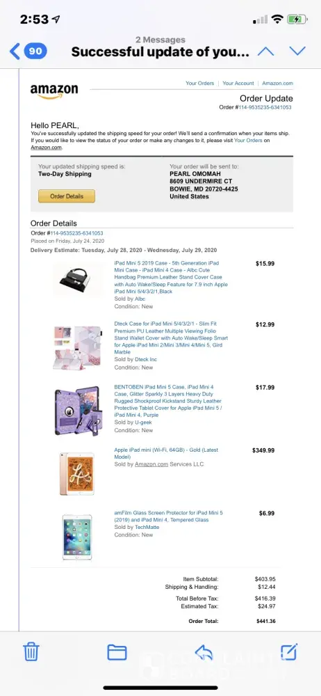 I ordered an iPad mini 5 and five other items on 7/26/20 and paid For two day shipping/delivery. I got a confirmation that they will arrive on 7/28-7/29. All the items arrive today but my iPad which arrived 7/30. I am so unhappy with how Amazon does business I could cry. This is the second time I have paid for express two day shipping and my item comes after three days. I paid for two day shipping and this item should be arriving today not tomorrow, yet it was just shipped to arrive tomorrow. I have purchased a lot of stuff from Amazon to be treated this way. Why the heck would I pay express shipping if it wasn't urgent? To say I am upset is an understatement! The Ipad I bought for my daughter days after I ordered this item from another seller on Amazon, came yesterday. Yet, my order that was supposed to arrive today after I paid to receive it on Wednesday is now coming on Thursday. Very disappointed and angry! The agent I chatted with did refund my shipping but that does not help my situation where my business will suffer for two days because the delivery will come late. So annoyed!