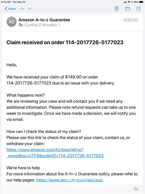 For the first case, I reached out to the seller multiple times and have been told to continue to wait. I filed an A-Z refund claim on May 18 with Amazon and I was told via email (and via chat) and online that it would take up to a week. A week went by and was then told it would take another week. I cannot seem to get a refund. The customer service chat person (because you can't speak to anyone on the phone right now) said and I quote, "if we refund you, you would be stealing from the seller". How could I be stealing when you took $150 of my money and did not deliver the product? I just want a refund. Amazon's policy for an A-Z refund says it may take up to a week. It's been over a week and nothing has happened. There has been no communication from Amazon.