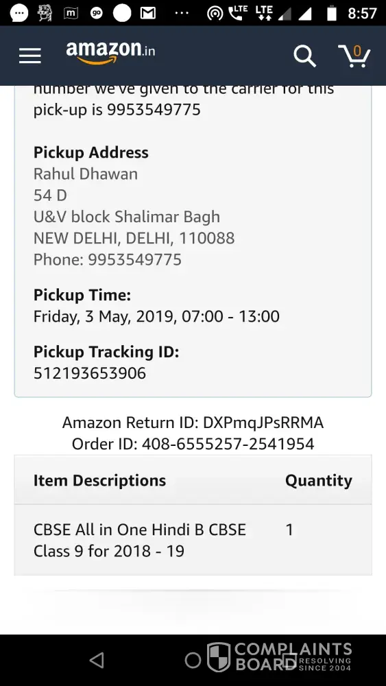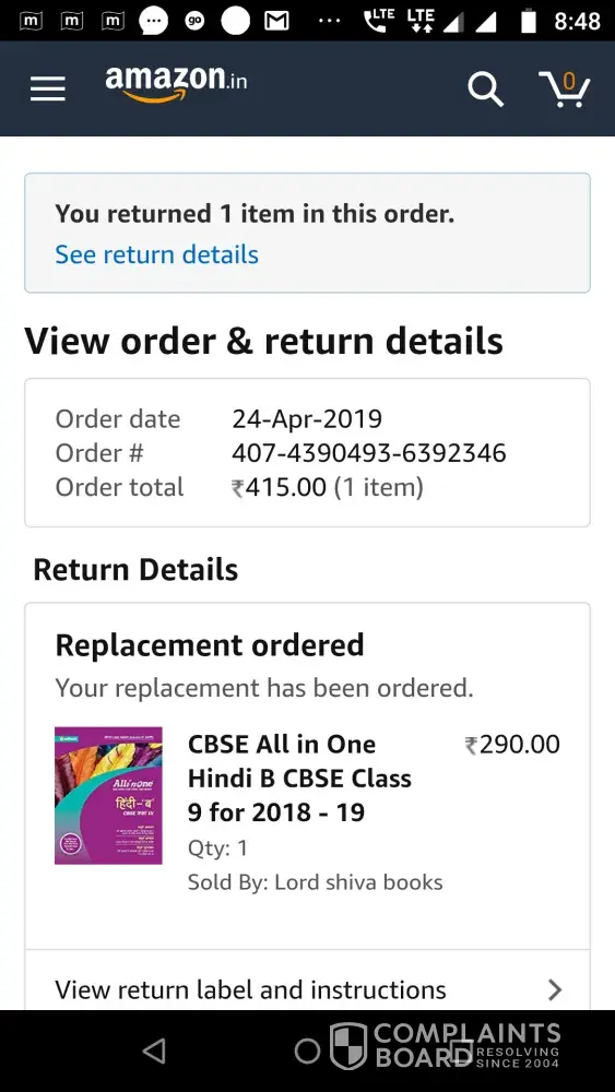 This is relation to an order I have placed on amazon for purchase of book i.e. "cbse all in one hindi b cbse class 9 for 2018-19" vide order number [protected] dated 24.04.2019 for which I have been charged rs. 415/- (rs. 290 towards cost of product and rs. 125 as postage and packing charges). The product was delivered on 28th april 2019 however the seller (lord shiva books) has supplied different and used book i.e. "cbse all in one hindi a cbse class 9 for 2018-19" for which I have drop a return and replacement request vide replacement number d63j5bplrrma.