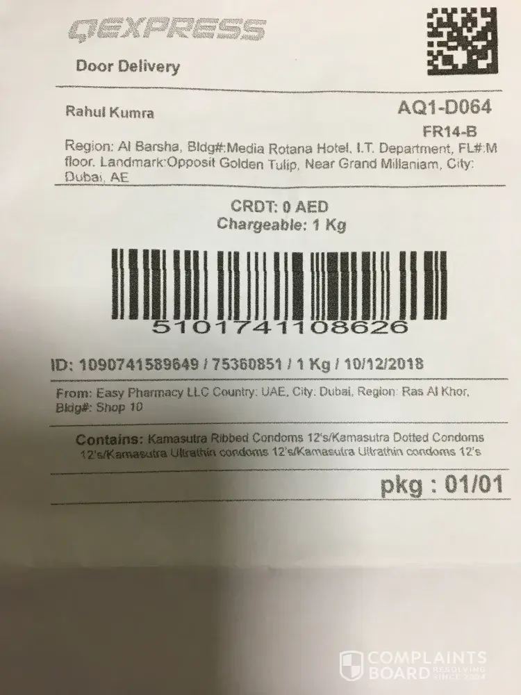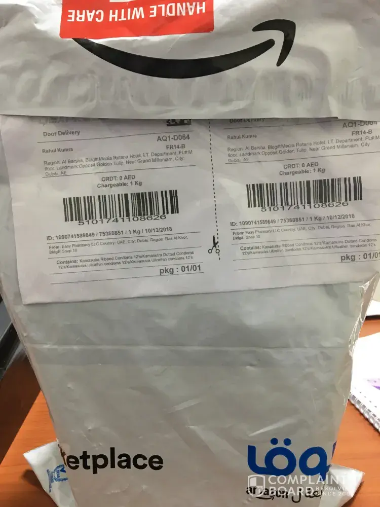 You advertise that the condom delivery will be very confidentially done but unfortunately the paper you attached on it has the whole items written on it (see attached) and now my whole office came to know about this delivery. The courrier note has all details why?