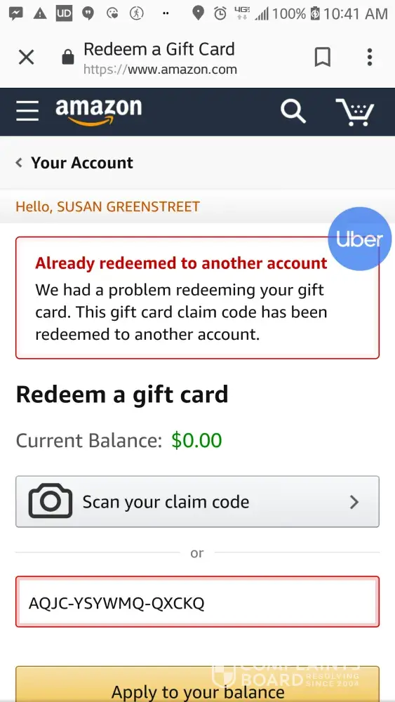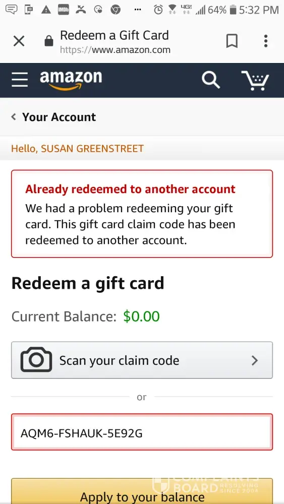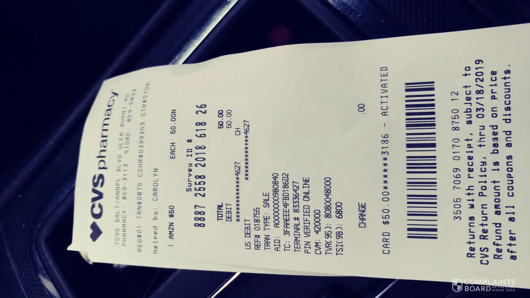 I purchased 2 cards for my best friend of 35 yrs & her daughter. I purchased the 1st one from Walgreens then spoke to her that day as we talk daily and she reminded me of her daughter's birthdays was a couple days later that's When I went back to CVS to purchase the 2nd card. When she went to use them she discovered they were no good. I was astonished in disbelief so I asked for the code, went to Amazon site myself to see if they could help and seen they were used on another account. I called my bank but recommended I get in touch with Amazon 1st. This is where I was sent online