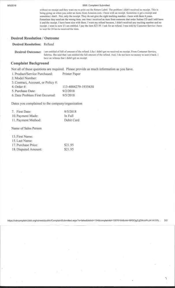 i am filing an complaint to Amazon.com. The address is 202 Westlake N #2, Seattle, WA, 98109, Telephone # [protected]. I am filing an complaint they are not going to give my refund back. i order an item, Georgia-Pacific Standard 92 multipurpose paper. 8.5 X inches 1 box of 3 packs, $21.95, the order number is [protected]. i didn't received no tracking number and they come with excuses that they have to contact the seller is Top Quality Product is Amazon.com. I want my refund back. I will continued asking for my money. Additional, I file complaint to BBB.com. Here is Complaint Number# [protected].