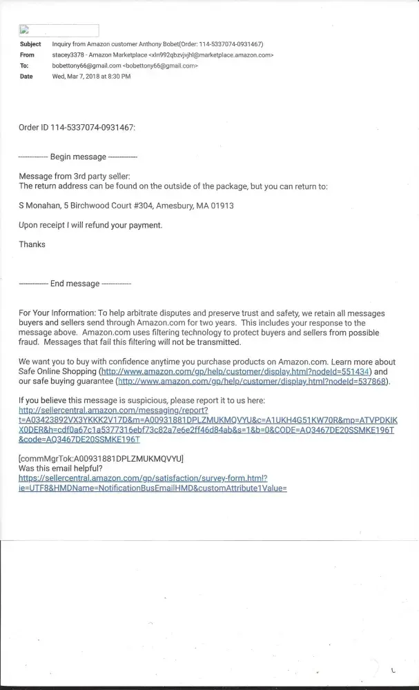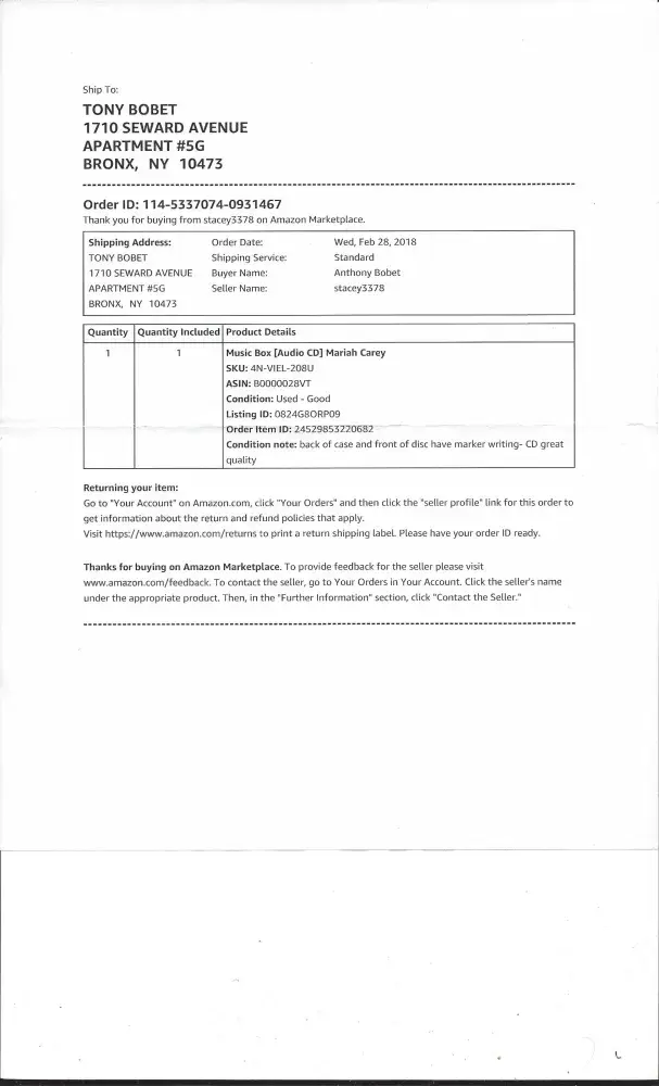My name is Tony Bobet resided at 1710 Seward Avenue, Bronx, New York City 10473, apart#5-g, I am filing an complaint to an commissioner, Stacey Monahan located at 5 Birchwood Court #304, Amesbury, MA 01913. I order an item its cd of Mariah Carey. when I received the item. its have her name on it. when I order it its doesn't say that a seller name will be there. and, they wait me to send it back without an return label.