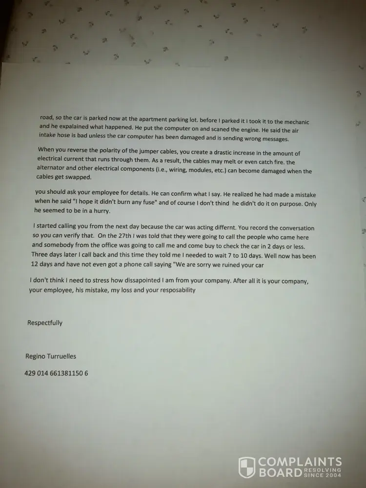 On july 18th I called aaa because I needed a jump start. An employee came an proceeded to the work but he was careless. He crossed the cables when trying to jump start the car causing a lot of sparks come out when trying to make the connection. A second try gave the same results. A third time was the right one, but by this time the battery was dead then and so other parts of the car I found out later. I had to buy another battery from him. After he installed the new battery he left. He said "I hope it didn't burn any fuses". He left right away. I tried the car around the block and I noticed the car was behaving different (like it was going to die any time). I took the car to the mechanic. He scanned it and the results were the air intake hose had been damaged (that would cost around 300 dollars but it is possible that the car computer has been damaged in which case it would cost 1000 dollars. Also they installed the wrong battery. That also can cause damages to the alternator. I have not been able to use the car anymore because it already died two times in the middle of traffic. I have called many times and I have written a letter to them. First they told me somebody would call me in two days. After three days I called back and then I was told I had to wait 7 to 10 days. Now it has been almost a month and nobody calls me for anything. I don't think they intent to accept the responsibility for ruining my car. They are just letting the time run and ignoring me after being their customer for years. The last time I called they gave a case number: cts 34252.