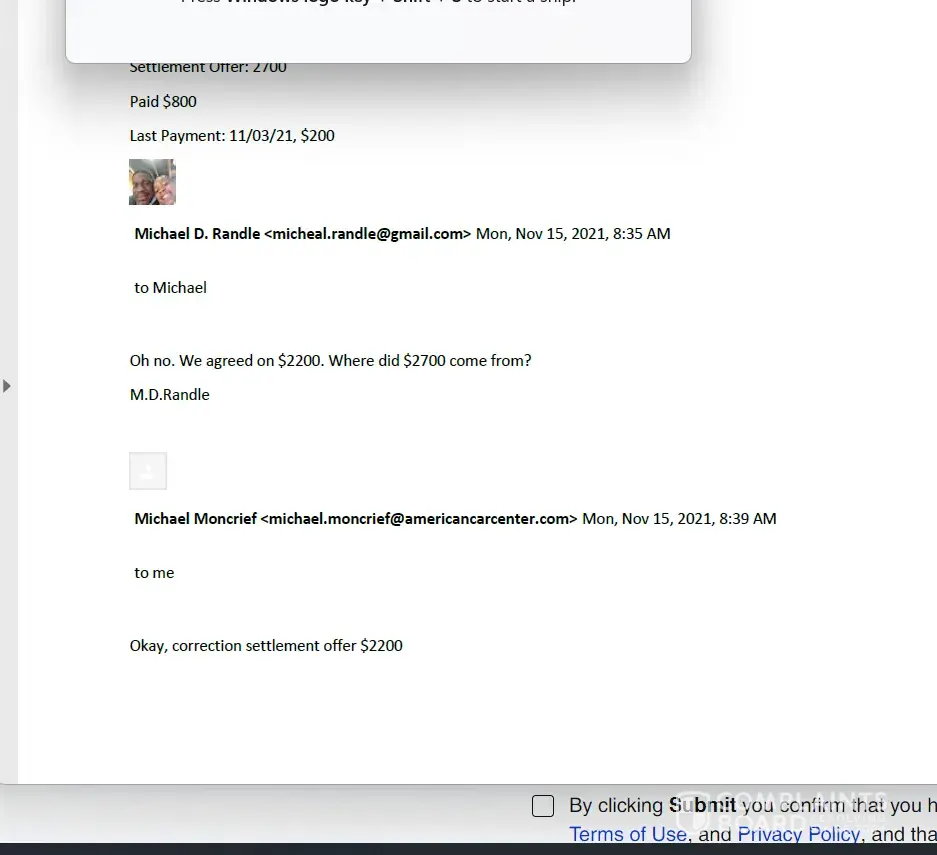 After voluntarily surrendered the vehicle to American Car center, I was told that I would have a balance, which I was fine with, I had no problem paying the price for dealing with these scam artists. I was put in touch with a American Car Credit redemption agent Michael Moncrief. An agreement was made that I would settle for $2200.00 with payments of $200.00 a month until the debt was satisfied. However, when I asked for a copy of this agreement in writing on a company letterhead, Mr. Moncrief promised me that I would be provided with it but I have yet to receive this document, this agreement was made in October of 2021. I asked Mr. Moncrief for receipts of received payments that shows that settlement amount and the remaining balance, once again he promised me that I would get it but I have not to date received any correspondence, electronic or otherwise from anybody at American Car Center.