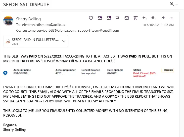 I received letter to pay in full an amount shown in the attached, which now appears to be a fraudulent collection because my credit report is showing 'Closed' with an amount due that I DO NOT OWE! I WANT MY CREDIT REPORT TO REFLECT THAT THIS WAS PAID IN FULL! I WILL GET AN ATTORNEY INVOLVED IF THIS ISN'T RESOLVED IMMEDIATELY!