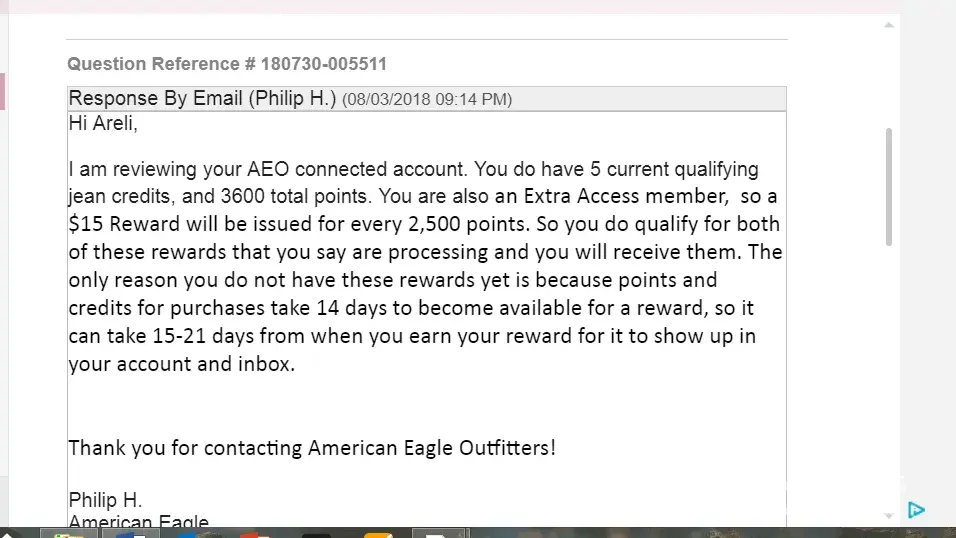 Hi according to AE connect, if you purchase 5 jeans the next one is free, I have purchased 8 jeans and I have not received a 15 dollar coupon nor a pair of free jeans as promised. I have contacted customer service numerous times and even made phone calls with AE connect, all stating and falsey reassuring me that i will receive my earned rewards withing 10 business days. NONE has happened. Its been about 3 months. I love American Eagle as their jeans are so comfortable but I am very unsatisfied with their service and false hopes. I never take the time to write down complains but this is beyond ridiculous.