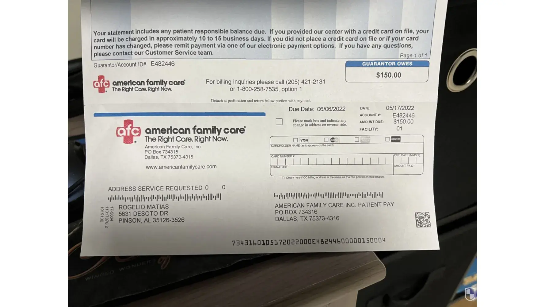 I received a charge of $150.00 from the American Family Care clinic. It is true that I was there and they took my data. But later they told me that they couldn't do it because according to them I was sick and I had to talk to my primary care doctor first and I went back home and then I went to the clinic in Trussvile. They attended me there and I paid $150.00 with a debit card and it was on 02-25-2022 and I have the proof