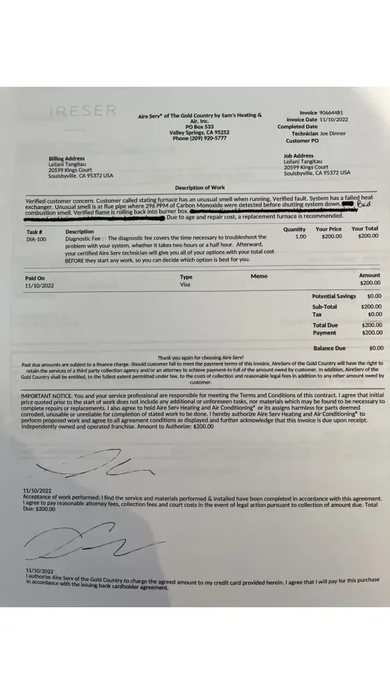 In the meantime, our ninety-six-year-old grandmother and terminally ill daughter is enduring unbearable cold weather conditions. We had no choice but to hire a local vendor called Aire Serve of The Gold Country to diagnose our heater on November 10, 2022 and paid a service fee of $200. The system has a failed heat exchanger, the unusual smell is coming from the flue pipe where 296 PPM of Carbon Monoxide were detected before shutting system down-Bad combustion smell. Verified flame is rolling back into the burner box. Due to age and repair cost a new unit is recommended. They recommended that we purchase space heaters for our home since AHS has failed to service our request since October 21, 2022 and the odds of AHS getting someone out for repairs has been painstakingly slow. We don't have an open floor plan and so seven space heaters were purchased from Amazon for $222.88.